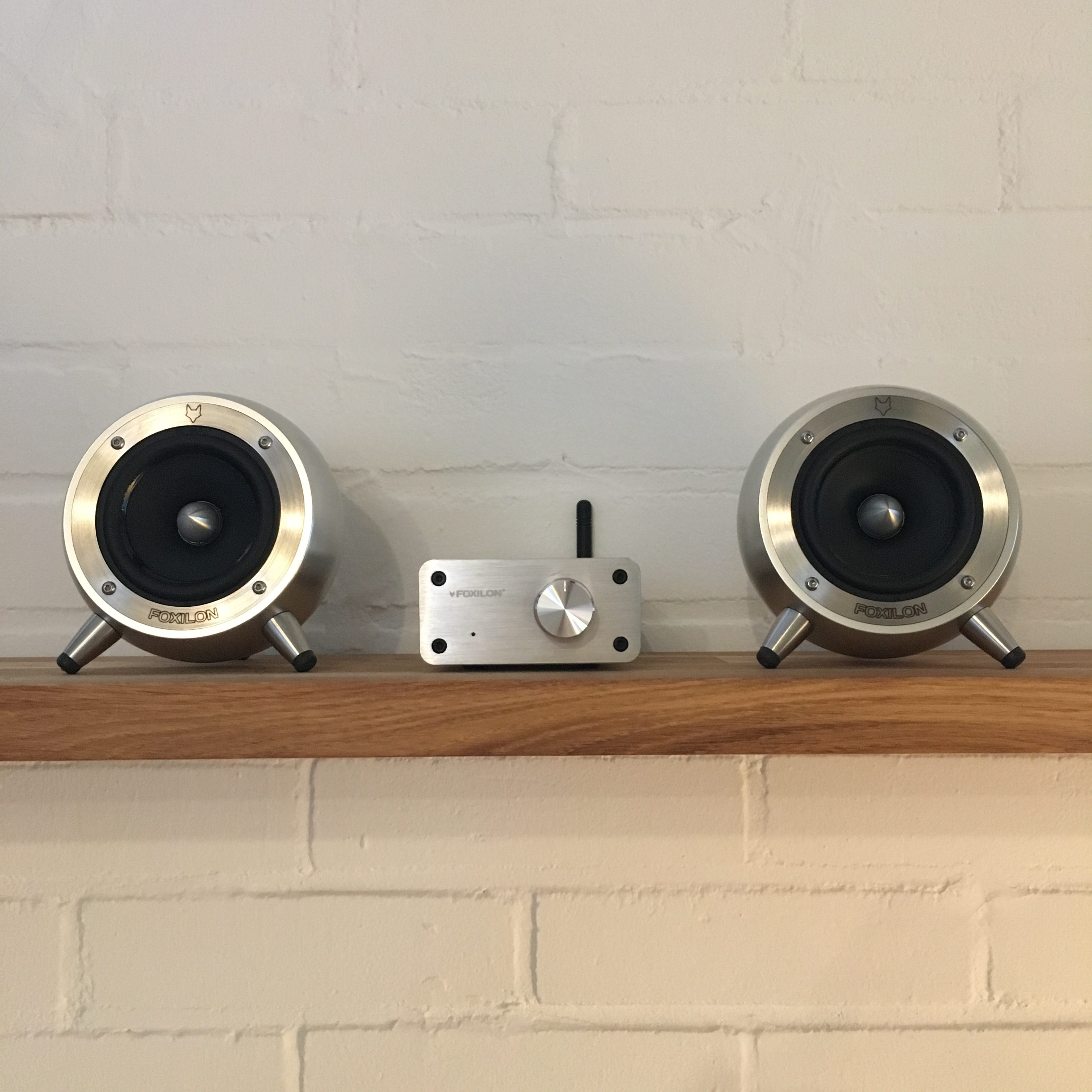 Een complete set met 2 bolvormige S115 luidsprekers en 1 A40 Bluetooth versterker.